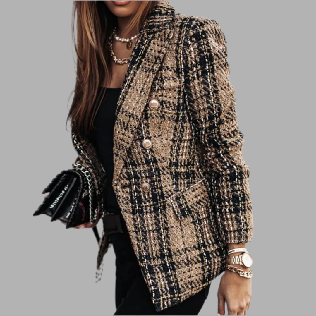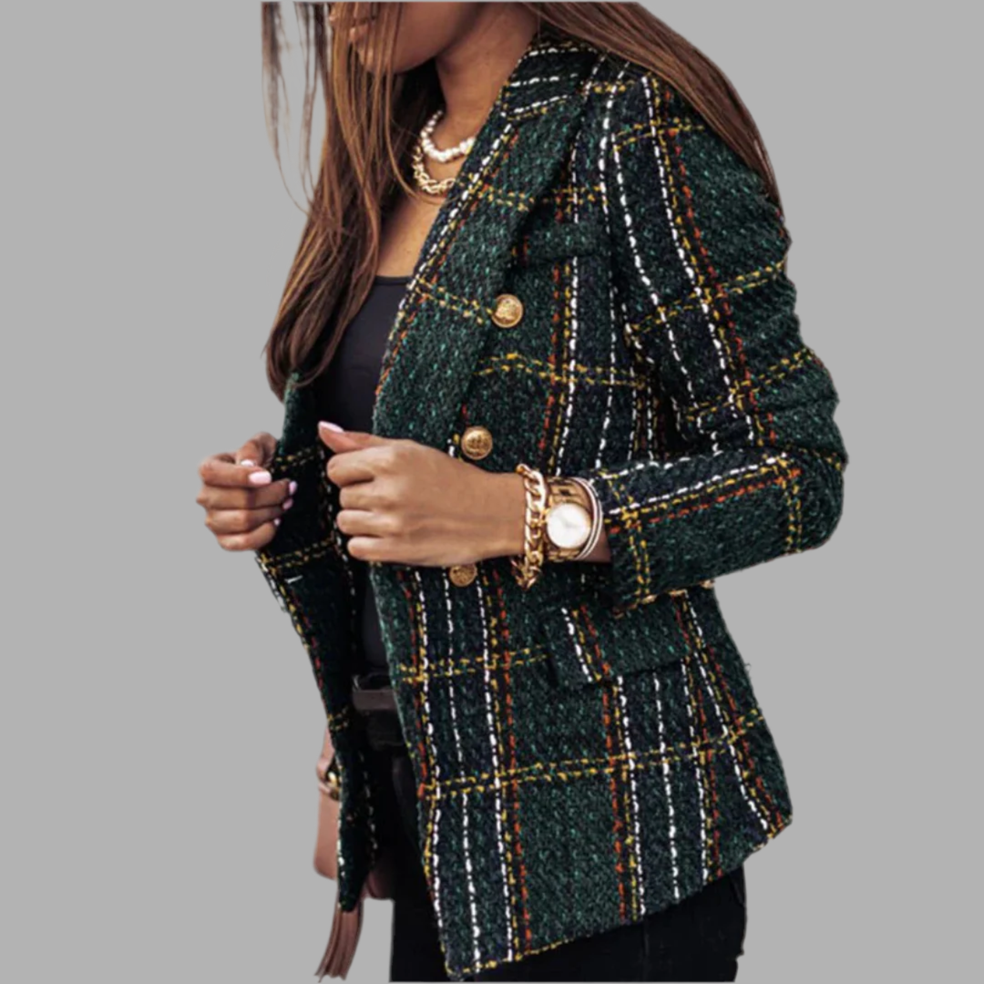 Deze blazer heeft een recht model en is uitgevoerd met een klassieke reverskraag. Het ontwerp wordt gekenmerkt door een geruit patroon en een doorlopende knoopsluiting aan de voorkant. De lange mouwen en de nette afwerking geven de blazer een verzorgde uitstraling. Dankzij het tijdloze ontwerp is dit kledingstuk veelzijdig te combineren.