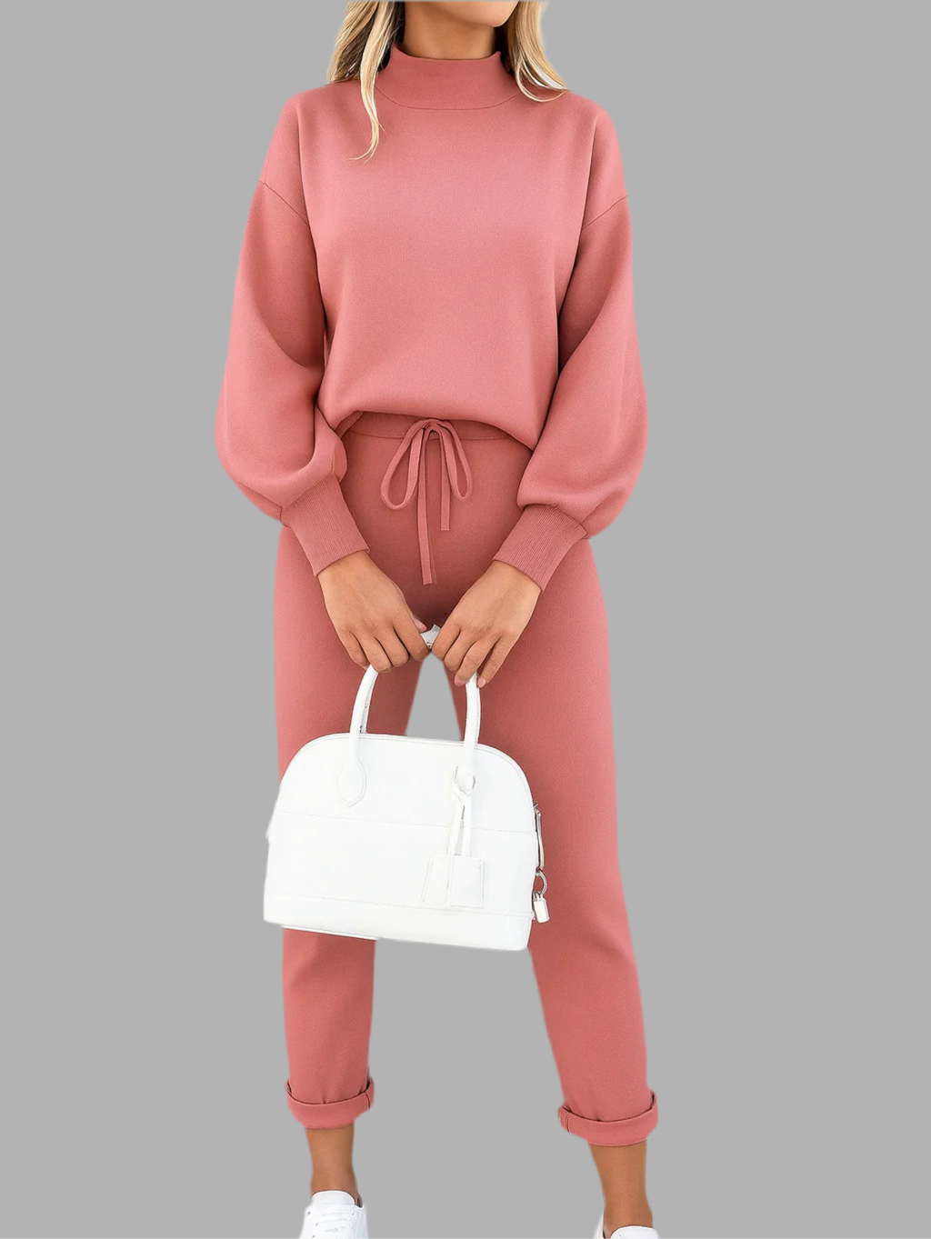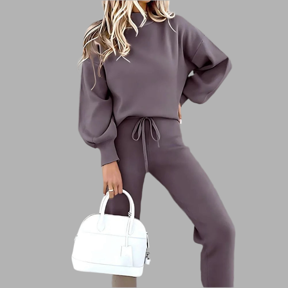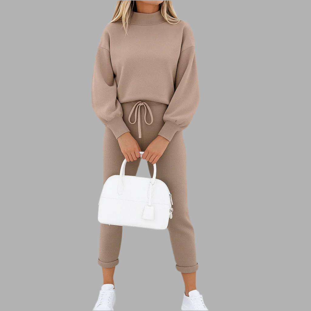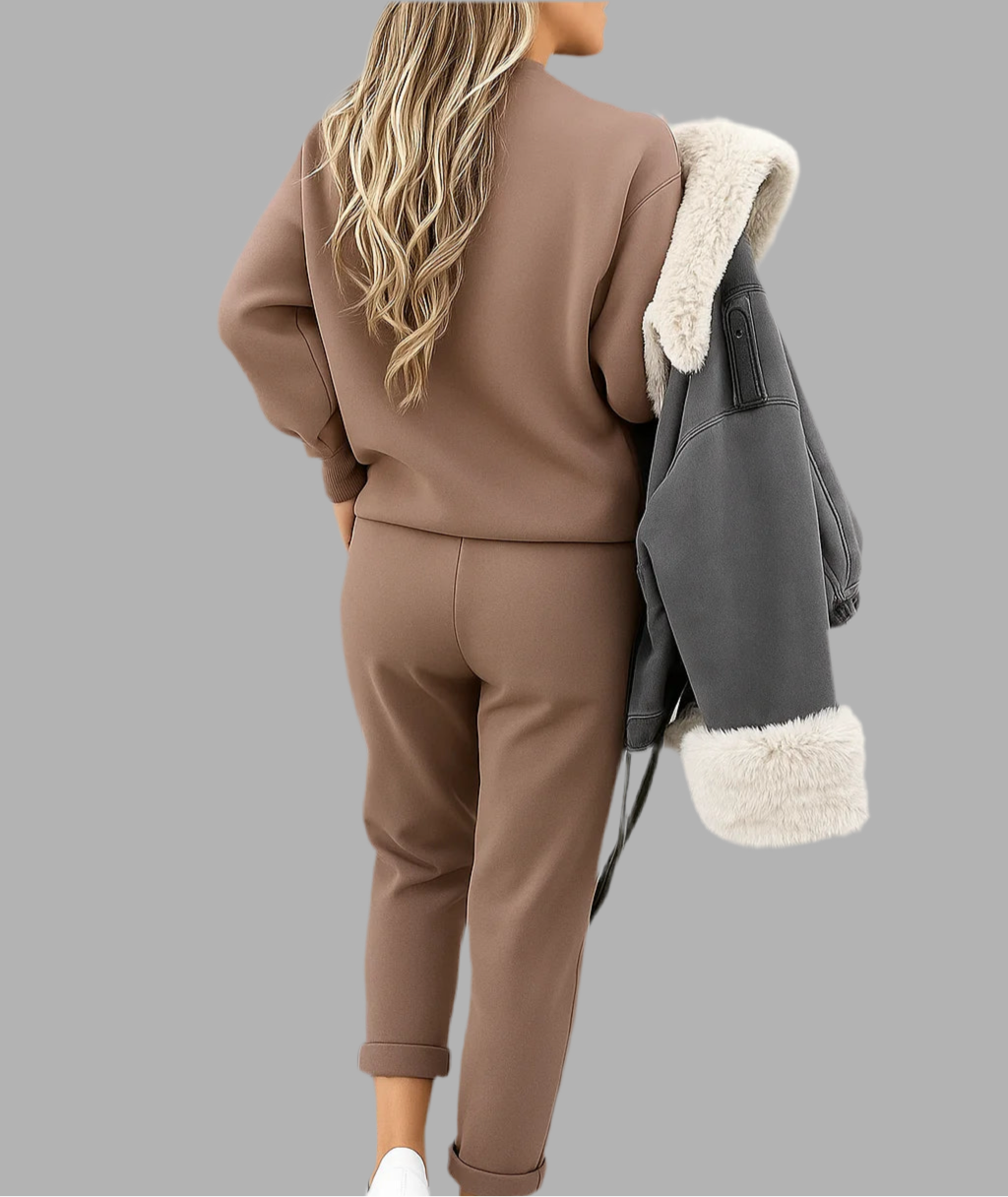 Deze dames set bestaat uit een trui met lange mouwen en een bijpassende broek in een recht model. De trui heeft een ronde hals en een losse pasvorm, terwijl de broek is uitgevoerd met een elastische tailleband en strakkere boorden aan de enkels. Het zachte materiaal voelt comfortabel aan en maakt de set geschikt voor dagelijks gebruik. Het eenvoudige ontwerp zorgt voor een veelzijdige en moderne uitstraling.