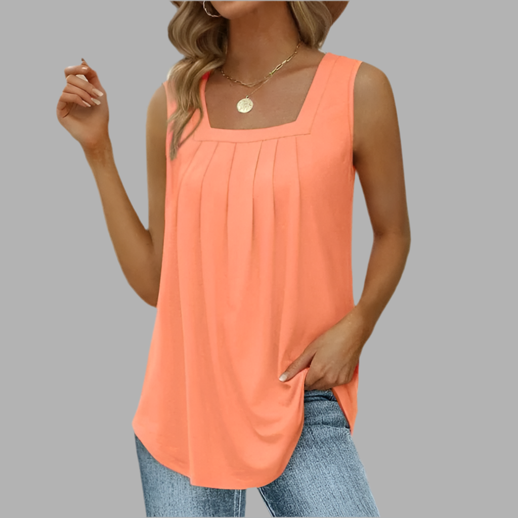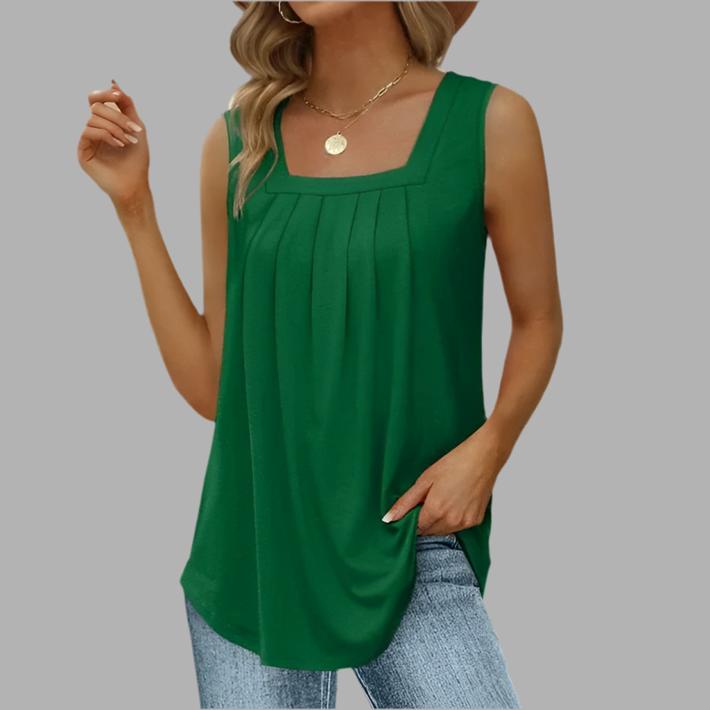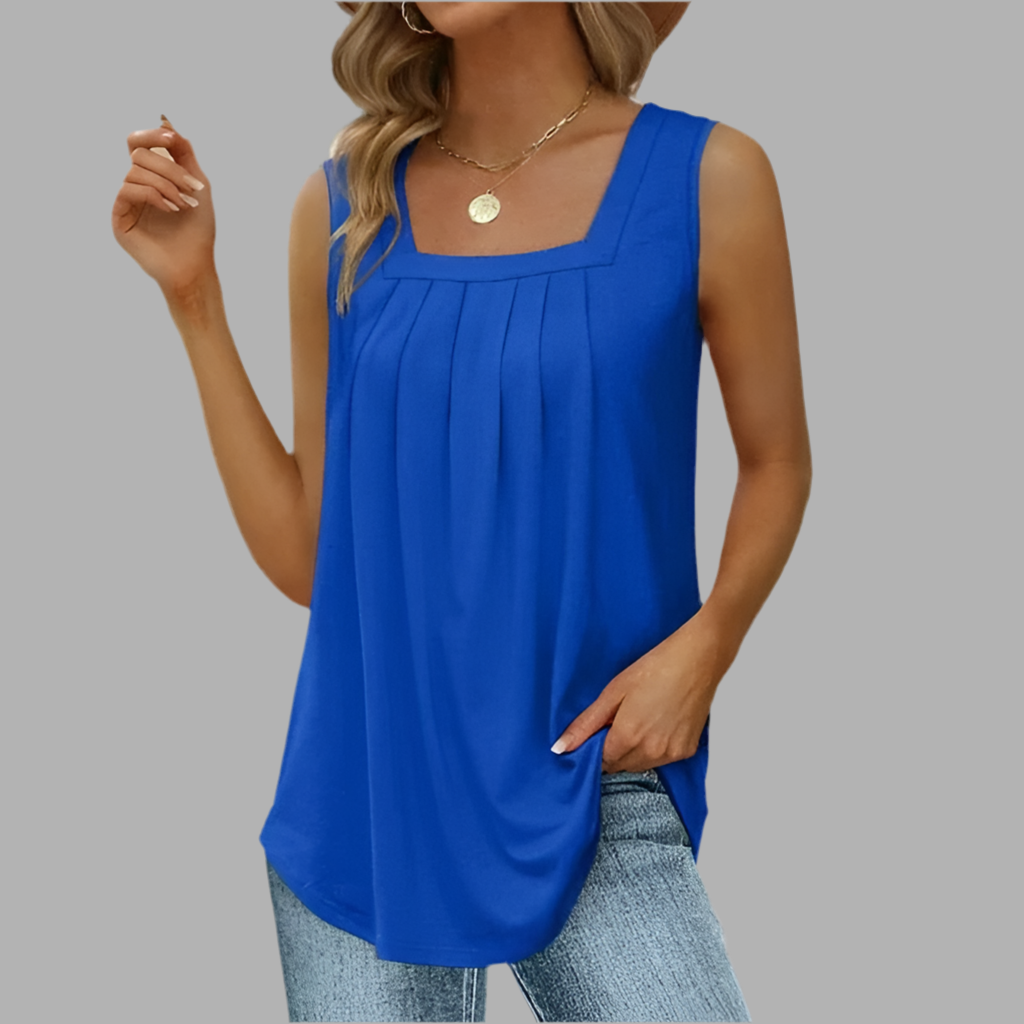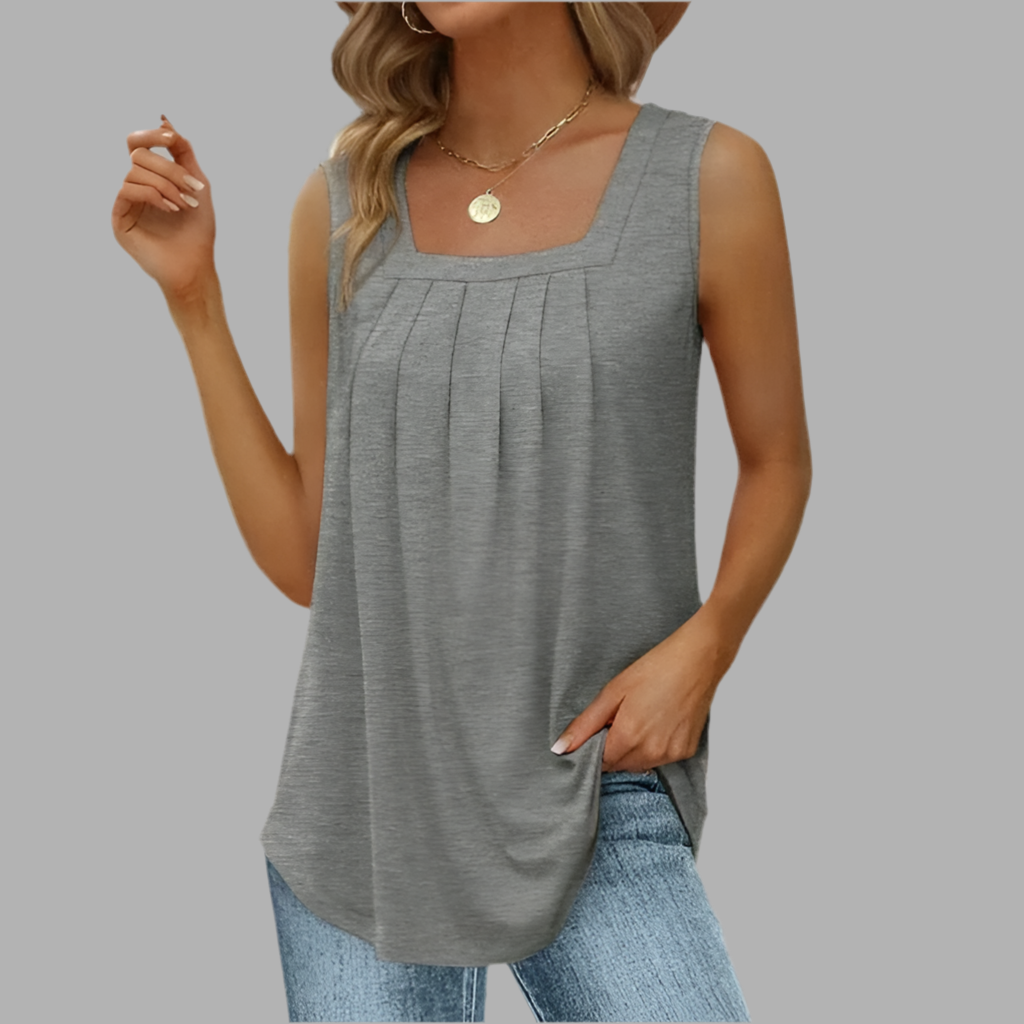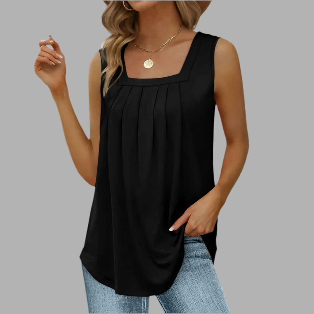 Deze top heeft een losvallend model en is mouwloos uitgevoerd. De vierkante halslijn en de plooidetails aan de voorzijde geven het ontwerp een verfijnde uitstraling. Dankzij de luchtige stof valt de top soepel en blijft de pasvorm comfortabel. Het eenvoudige ontwerp maakt dit kledingstuk veelzijdig en tijdloos.