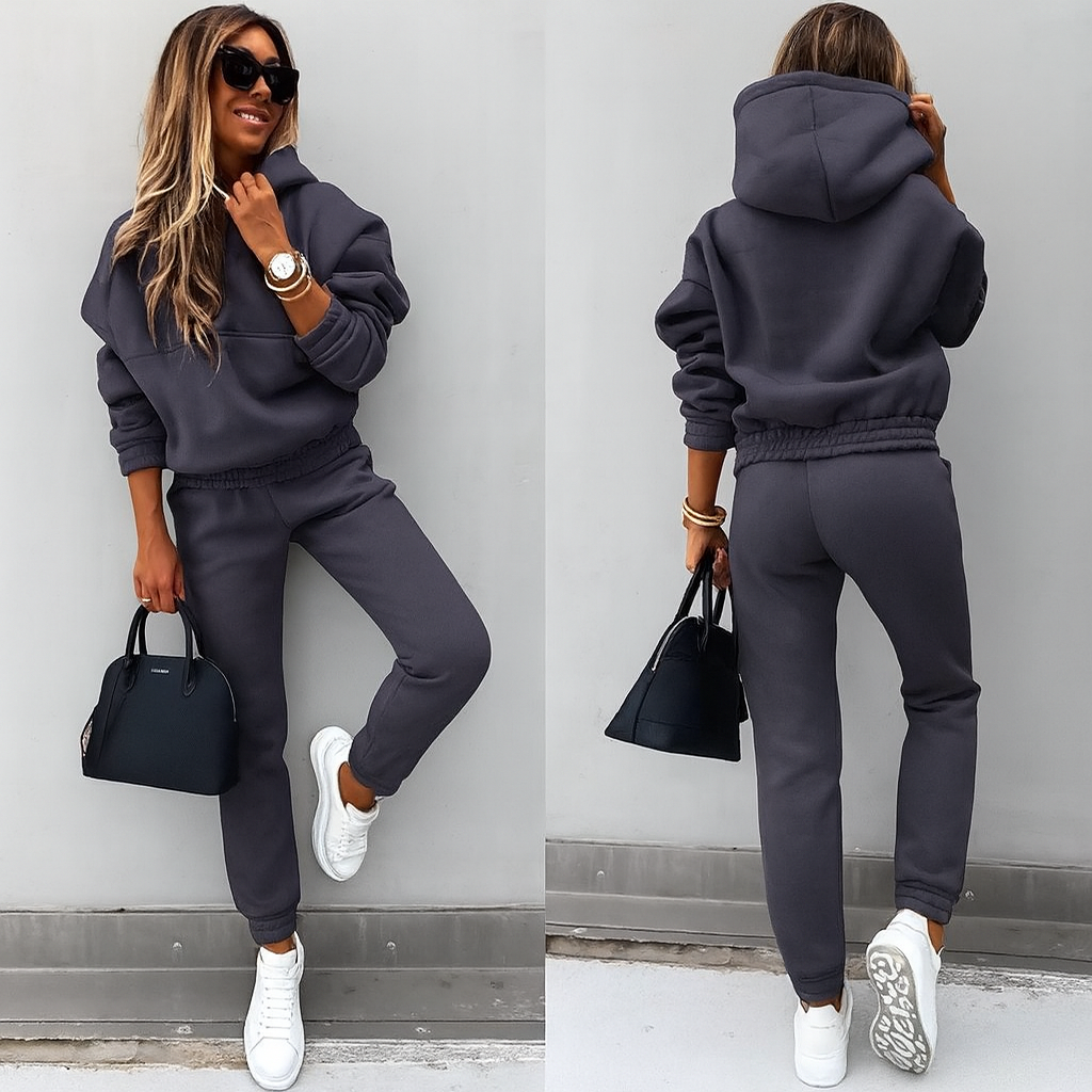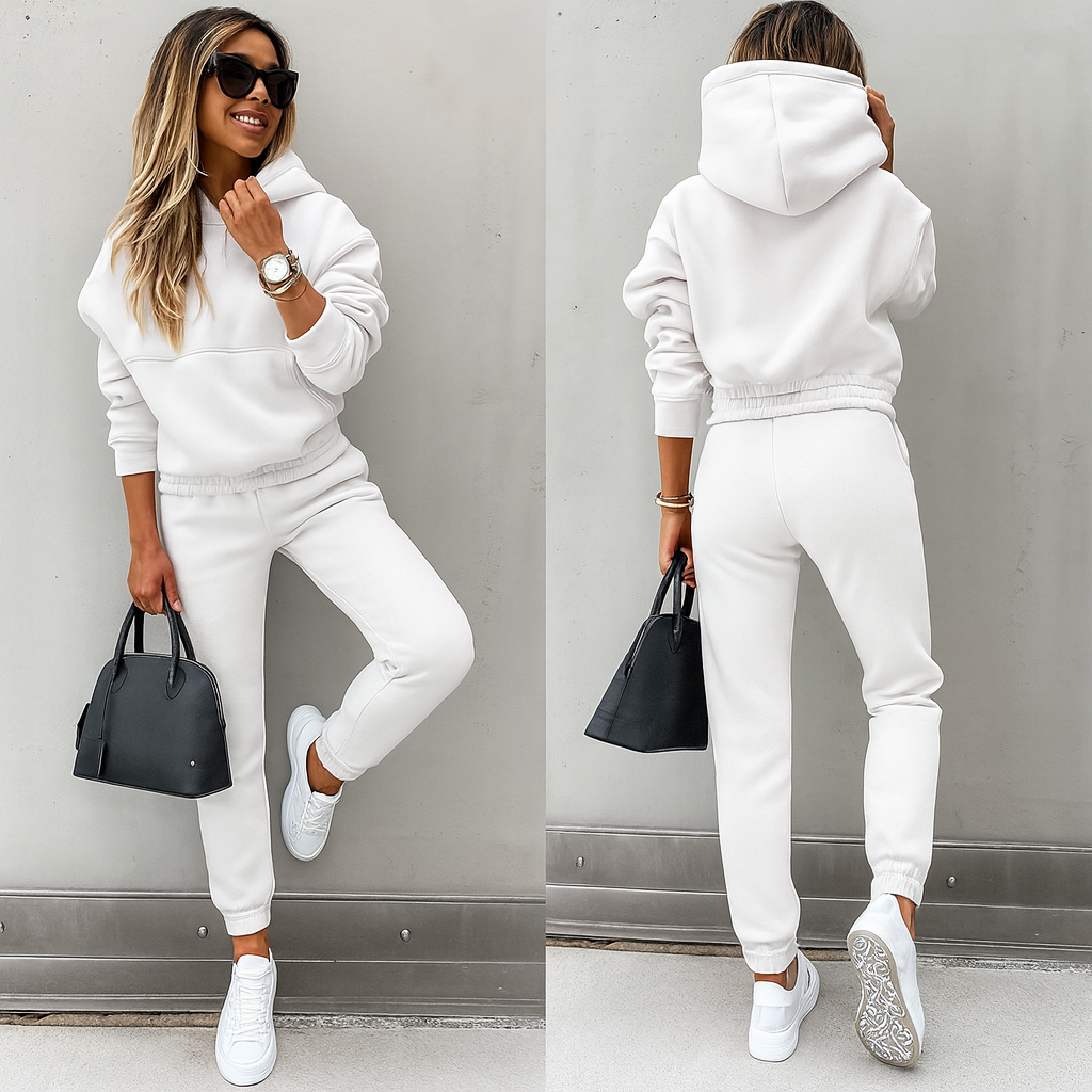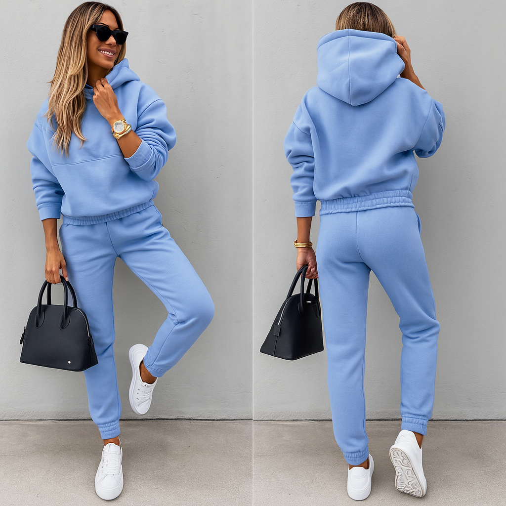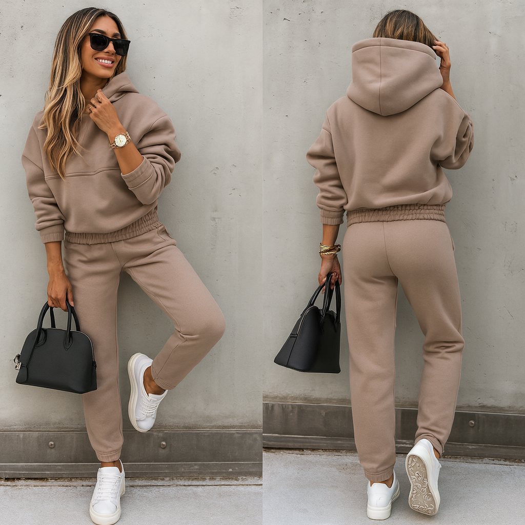 Deze set bestaat uit een hoodie en een bijpassende joggingbroek. De hoodie heeft een capuchon en lange mouwen, terwijl de broek is uitgevoerd met een elastische tailleband en rechte pijpen. Het geheel zorgt voor een comfortabele en sportieve uitstraling, ideaal voor casual of ontspannen gelegenheden.