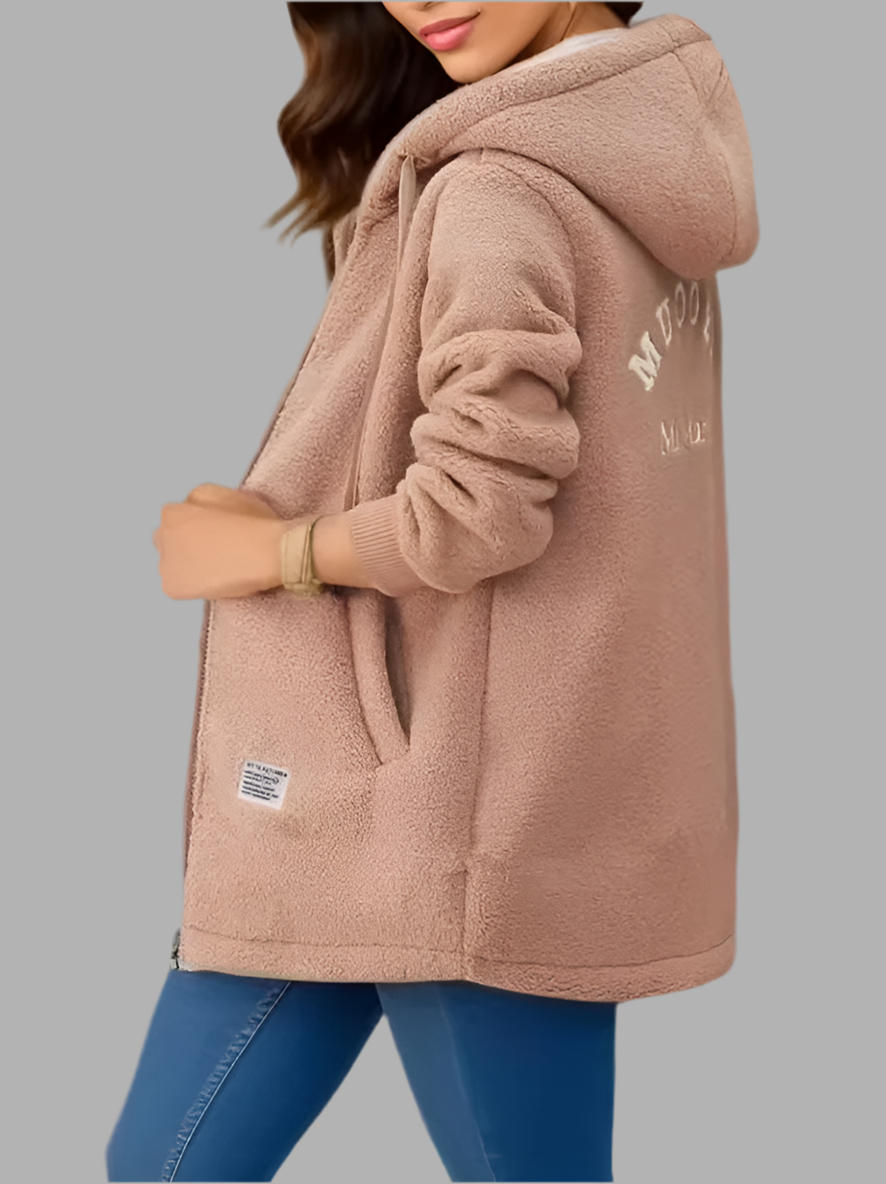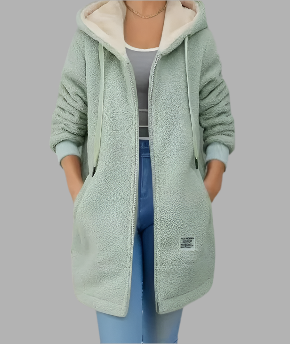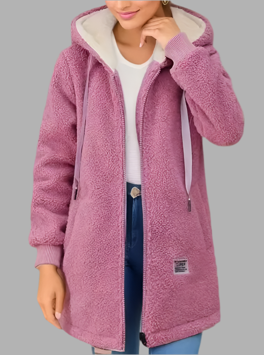 Deze damesjas heeft een losvallend model met een capuchon en een doorlopende ritssluiting. Het zachte, gestructureerde materiaal geeft het ontwerp een casual en comfortabele uitstraling. Aan de voorkant bevinden zich praktische steekzakken die extra gemak bieden. De rechte zoom en lange mouwen maken de jas compleet en zorgen voor een tijdloze look.
