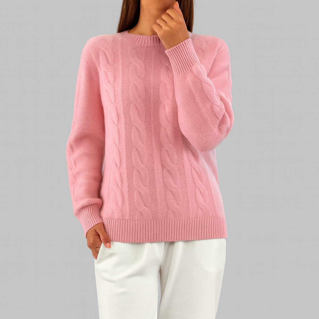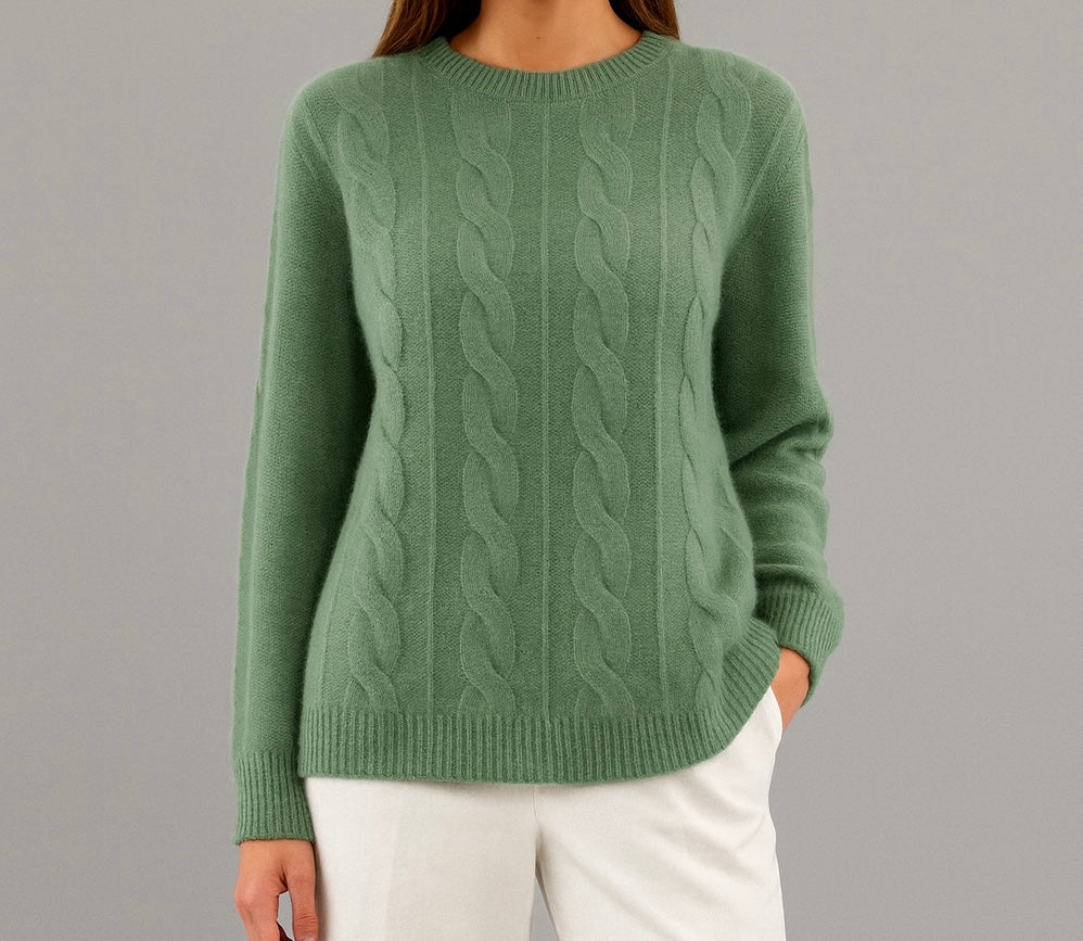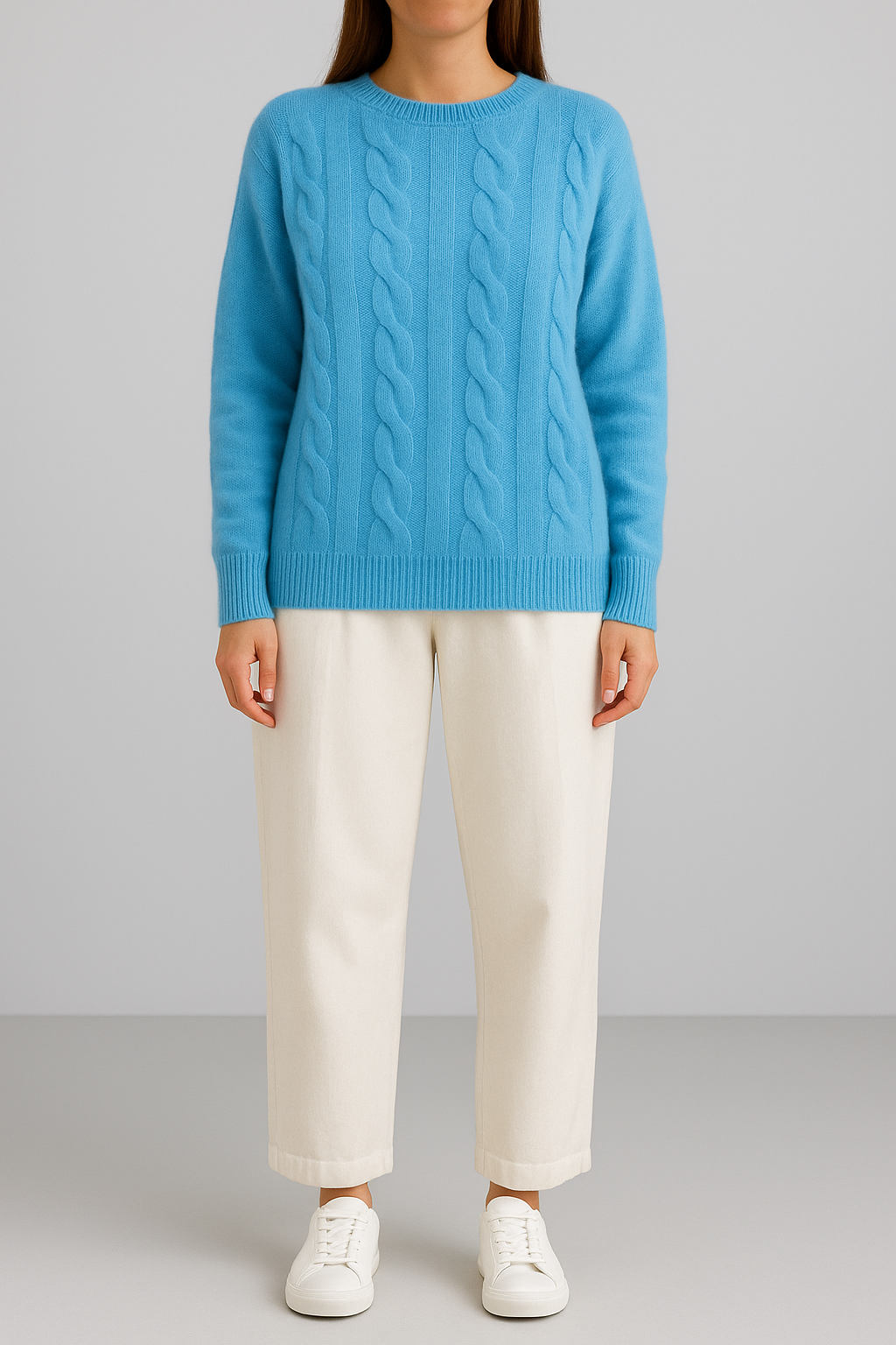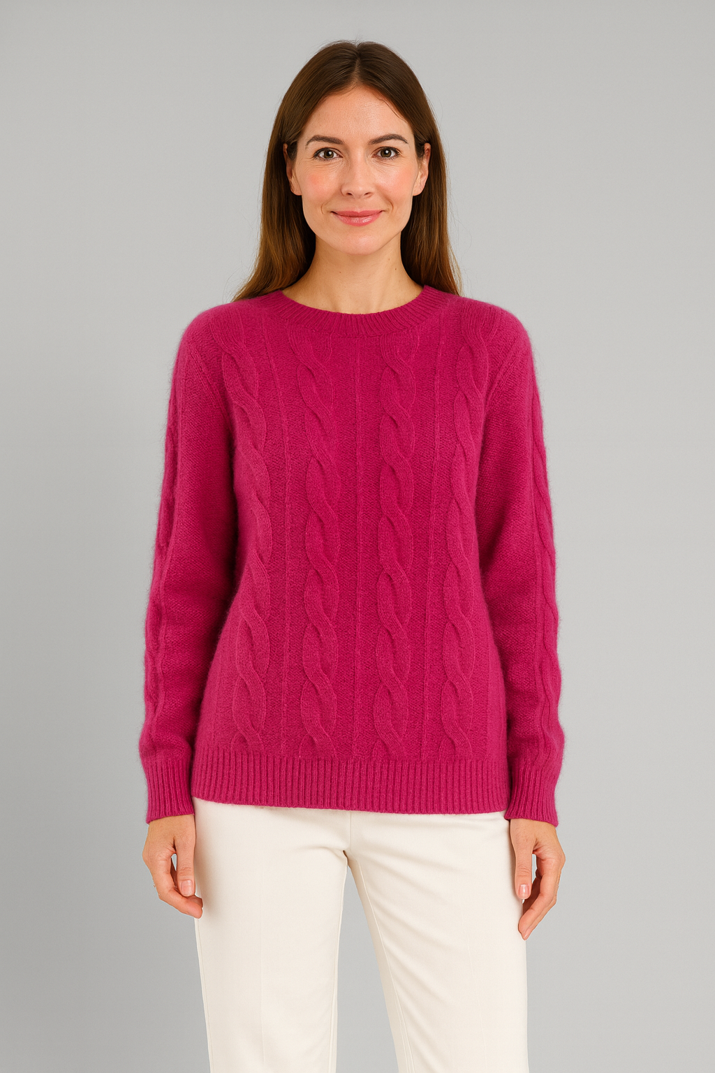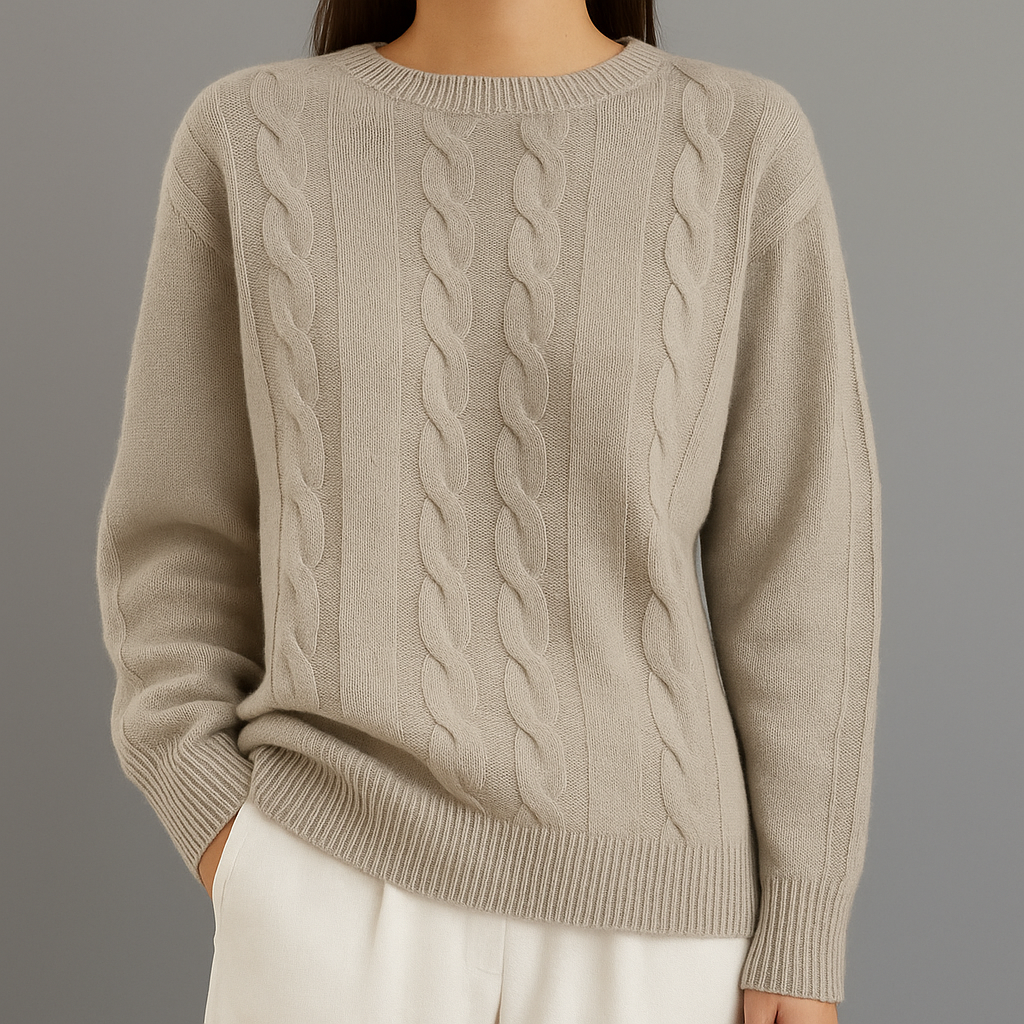 Deze trui is uitgevoerd in een recht model en voorzien van een kabelgebreid patroon aan de voorzijde. De ronde hals en lange mouwen geven de trui een klassieke uitstraling. Het stevige breisel zorgt ervoor dat de vorm goed behouden blijft en draagt bij aan het tijdloze ontwerp.