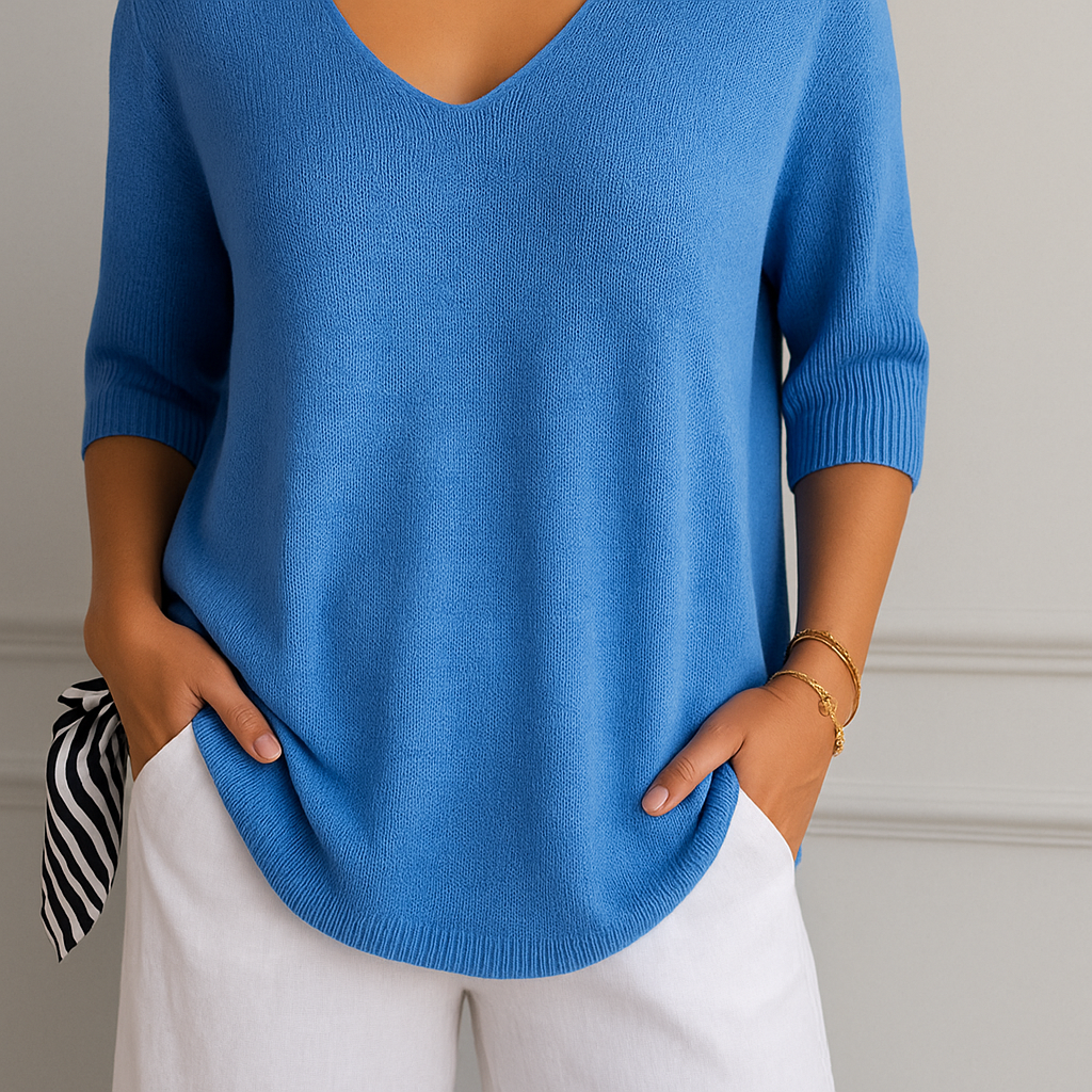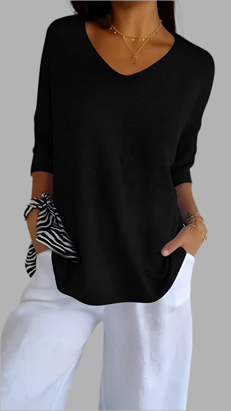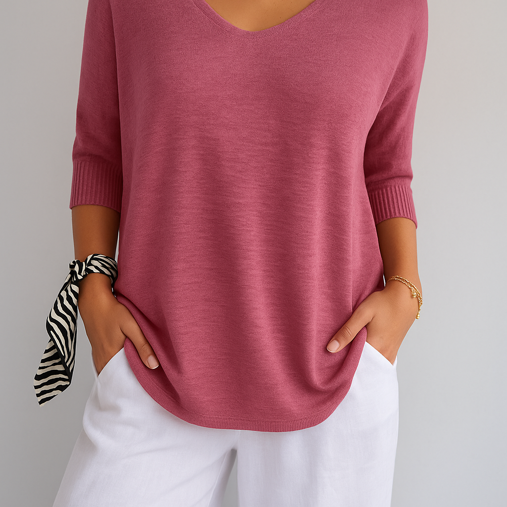 Deze damestrui is uitgevoerd met een lichte V-hals en een losvallend ontwerp dat zorgt voor een ontspannen uitstraling. De driekwartmouwen geven extra bewegingsvrijheid en maken het model geschikt voor dagelijks gebruik. Het zachte materiaal voelt prettig aan op de huid en draagt bij aan een comfortabel draaggevoel. Door de eenvoudige afwerking en de rechte zoom is de trui veelzijdig te combineren.