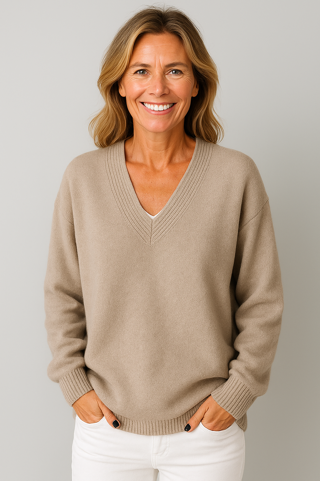Deze damestrui heeft een V-hals en een recht model met lange mouwen. De ribboorden aan de manchetten en zoom zorgen voor een nette afwerking en behouden de vorm van de trui. Het materiaal voelt zacht aan en draagt bij aan een comfortabel draaggevoel. Het eenvoudige ontwerp maakt het kledingstuk veelzijdig combineerbaar.