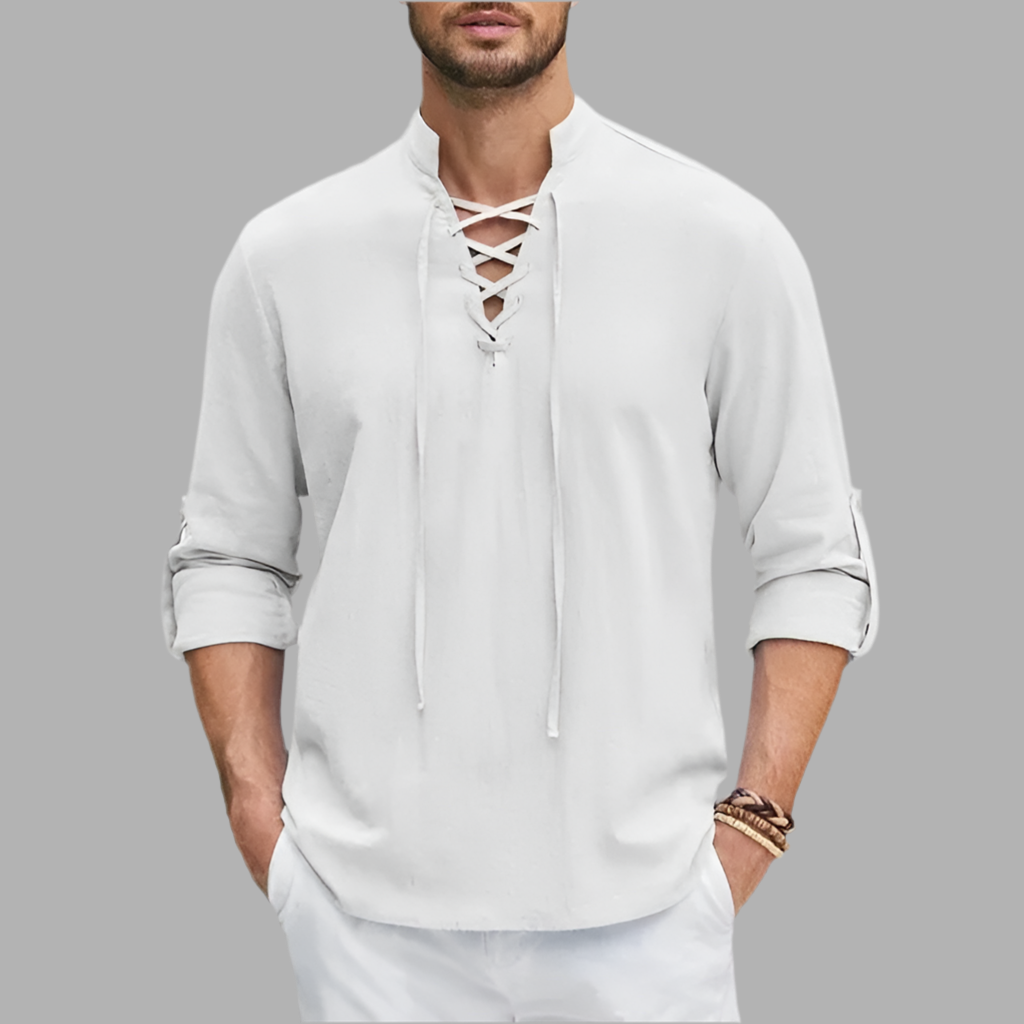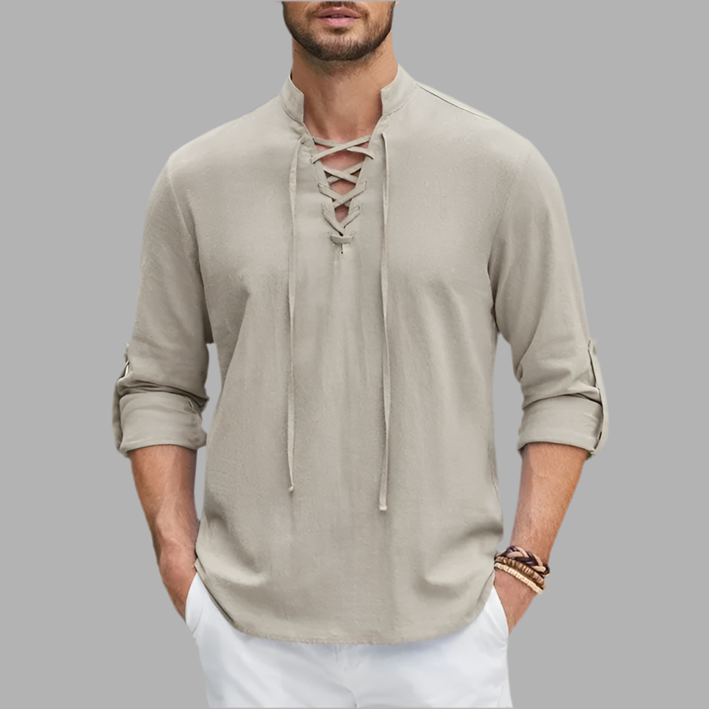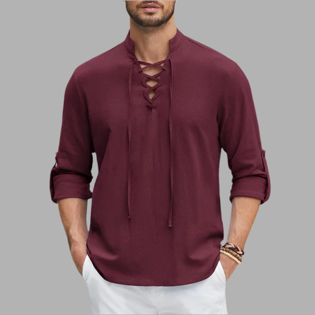 Dit is een heren overhemd met een v-hals en veterkoordsluiting in plaats van de traditionele knopen. Het heeft lange mouwen die casual kunnen worden opgerold, wat het een ontspannen en zomerse uitstraling geeft. Het luchtige materiaal maakt het ideaal voor warme dagen of voor een bohemian/mediterrane stijl.