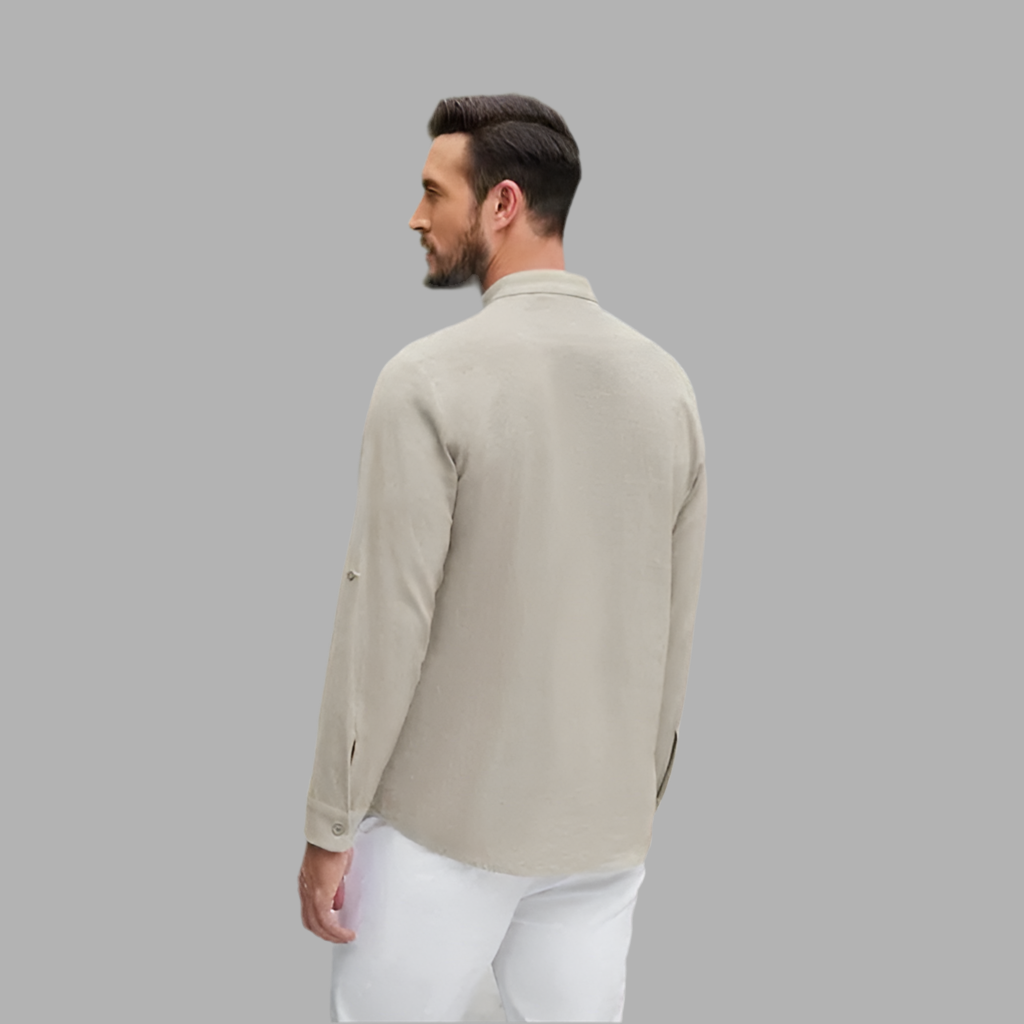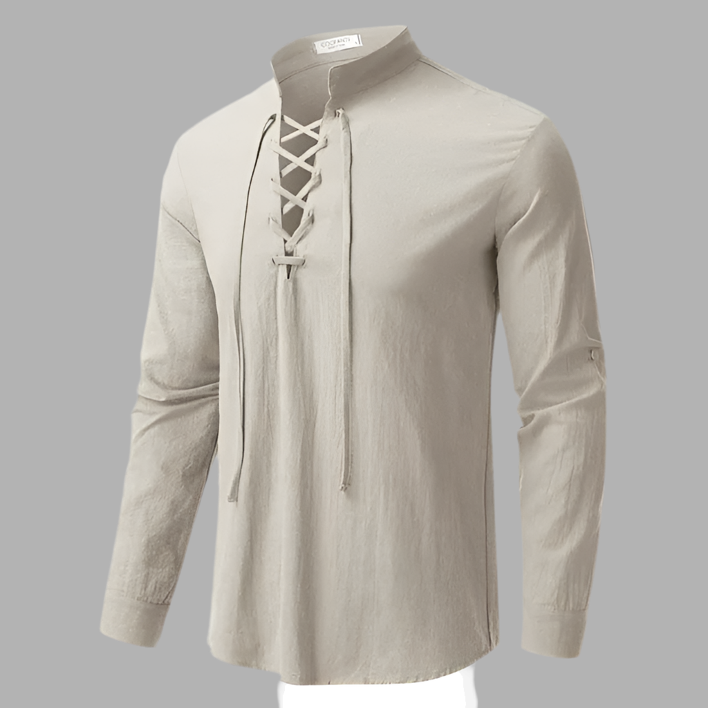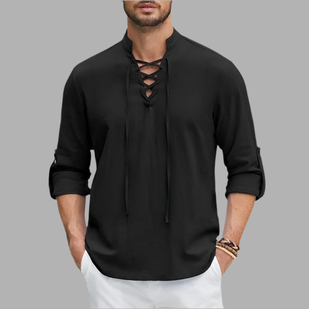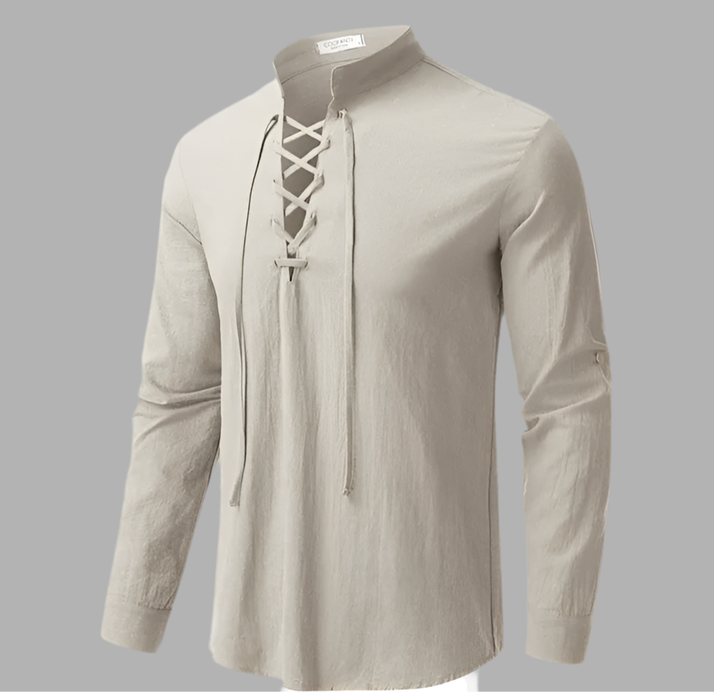 Dit is een heren overhemd met een v-hals en veterkoordsluiting in plaats van de traditionele knopen. Het heeft lange mouwen die casual kunnen worden opgerold, wat het een ontspannen en zomerse uitstraling geeft. Het luchtige materiaal maakt het ideaal voor warme dagen of voor een bohemian/mediterrane stijl.