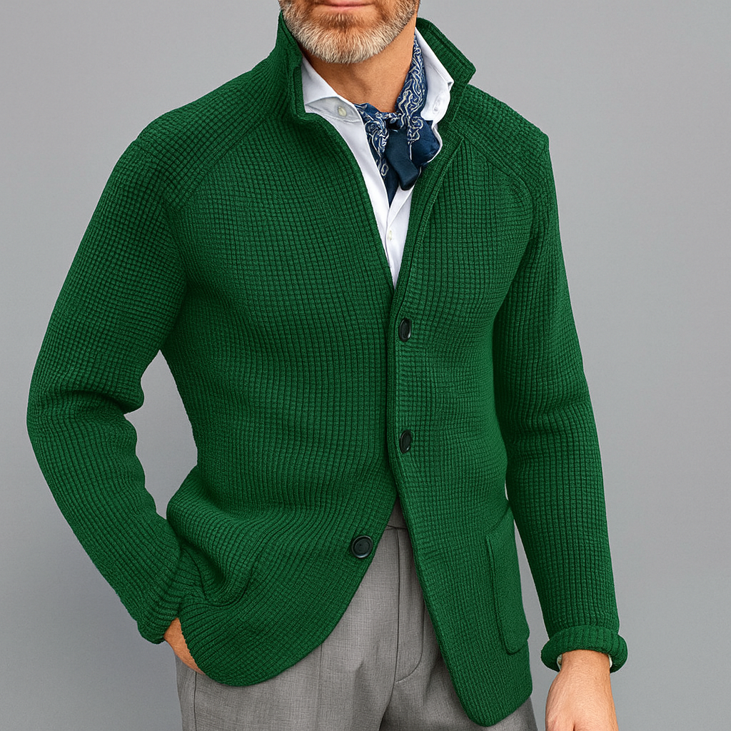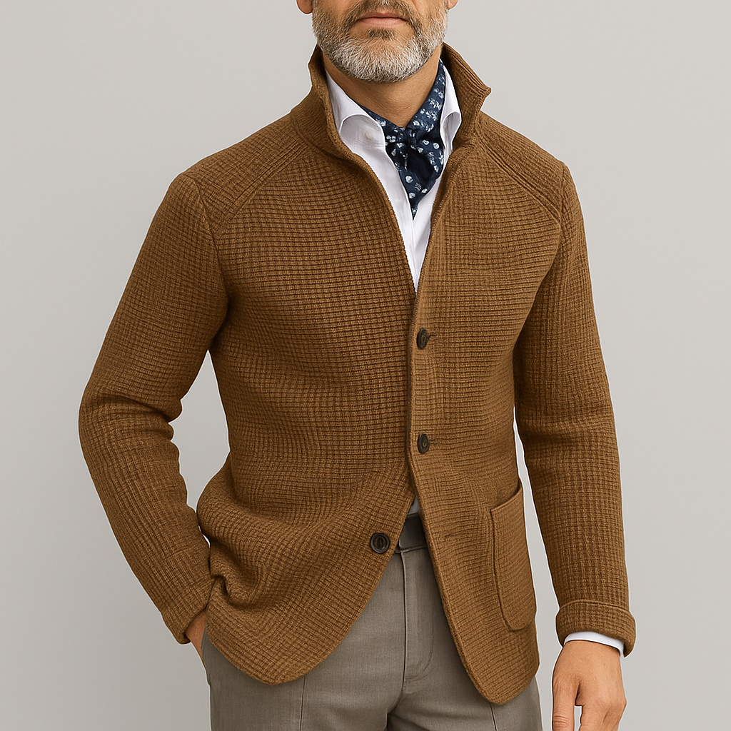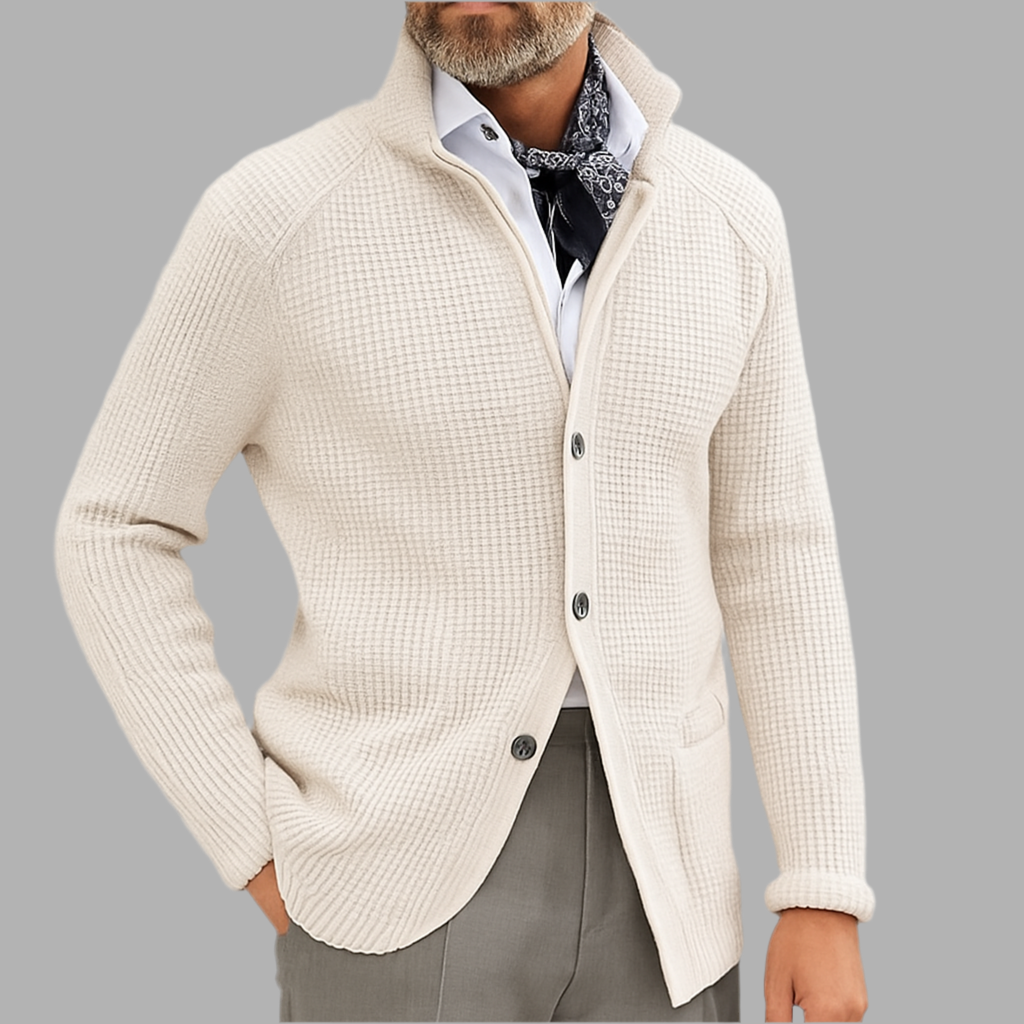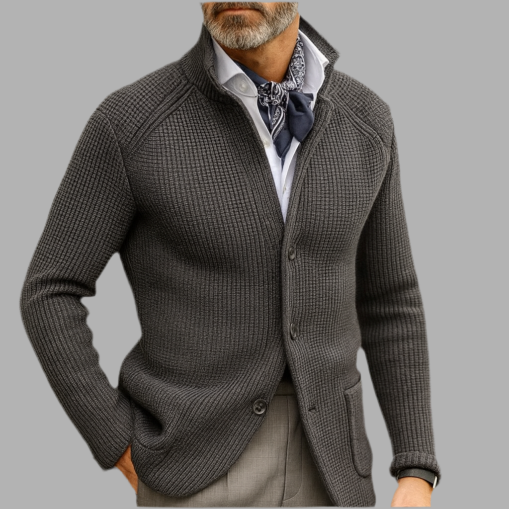 Dit herenvest heeft een klassiek ontwerp met een doorlopende knoopsluiting en een opstaande kraag. De structuur van het breisel geeft het kledingstuk een verzorgd en tijdloos karakter. Aan de voorkant zijn twee zakken verwerkt die het model een praktische toevoeging geven. De ribboorden bij de mouwen en zoom zorgen voor een goede pasvorm en extra draagcomfort.