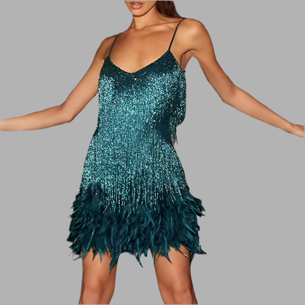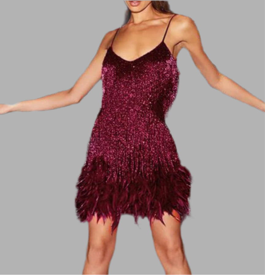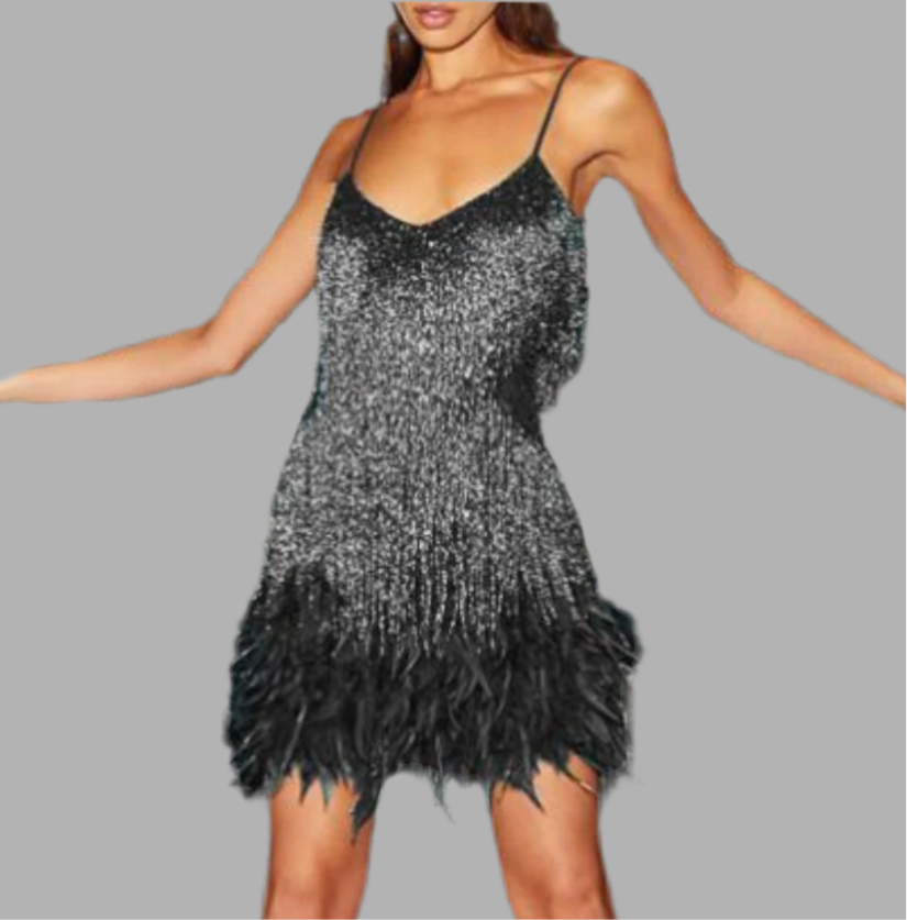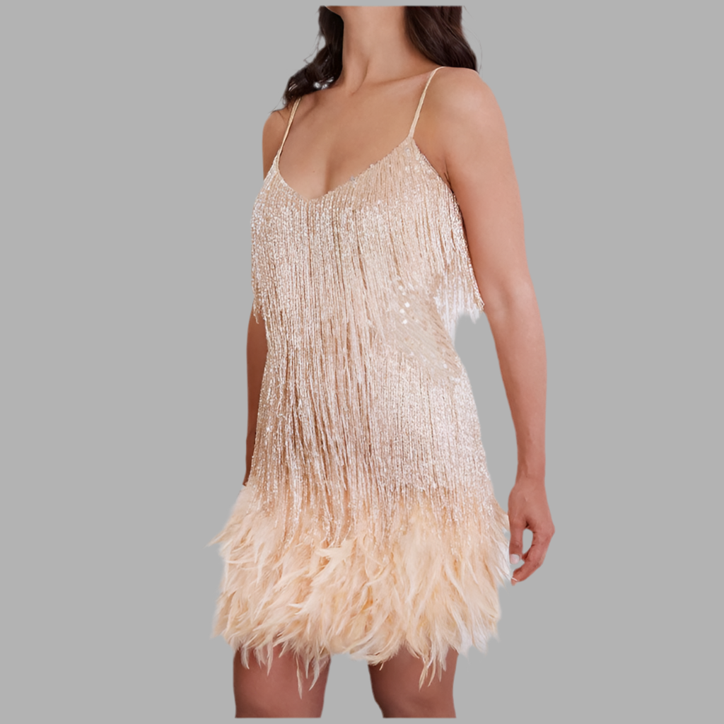 Deze jurk heeft een kort en recht model met smalle schouderbandjes. Het ontwerp is voorzien van meerdere lagen franjes die zorgen voor een speelse en opvallende uitstraling. De diepe halslijn en de strakke pasvorm benadrukken het elegante karakter. Dankzij de verzorgde afwerking blijft de jurk goed in vorm.