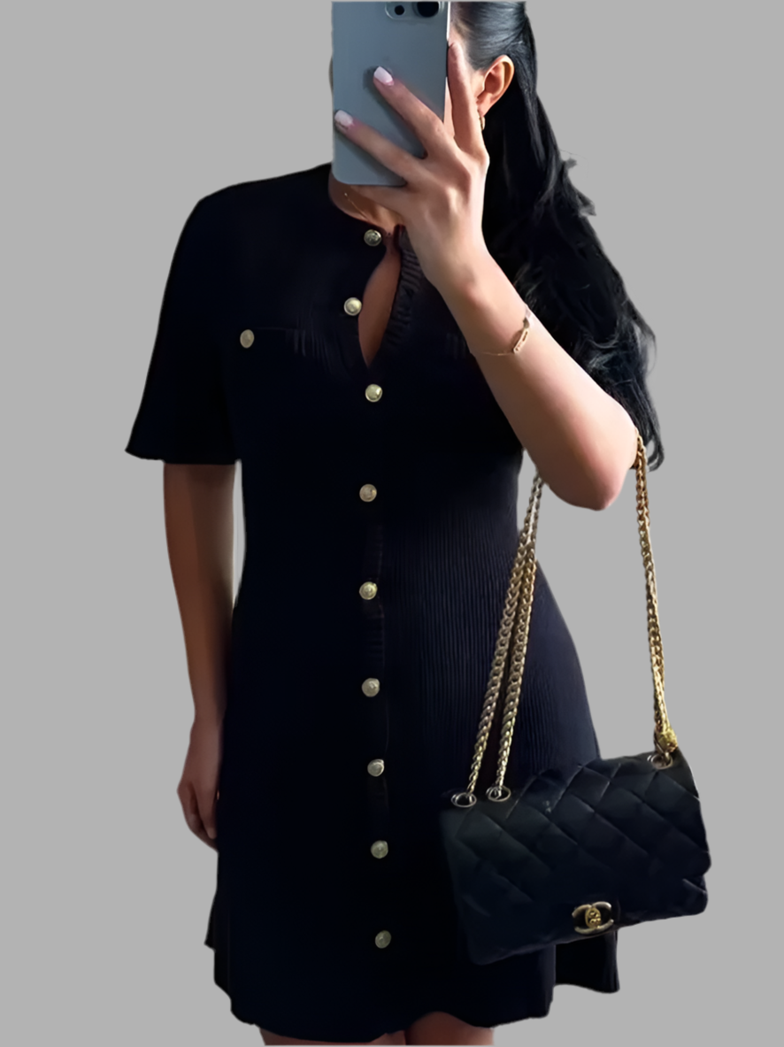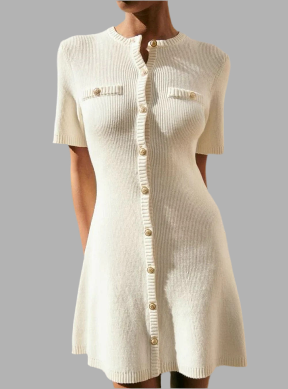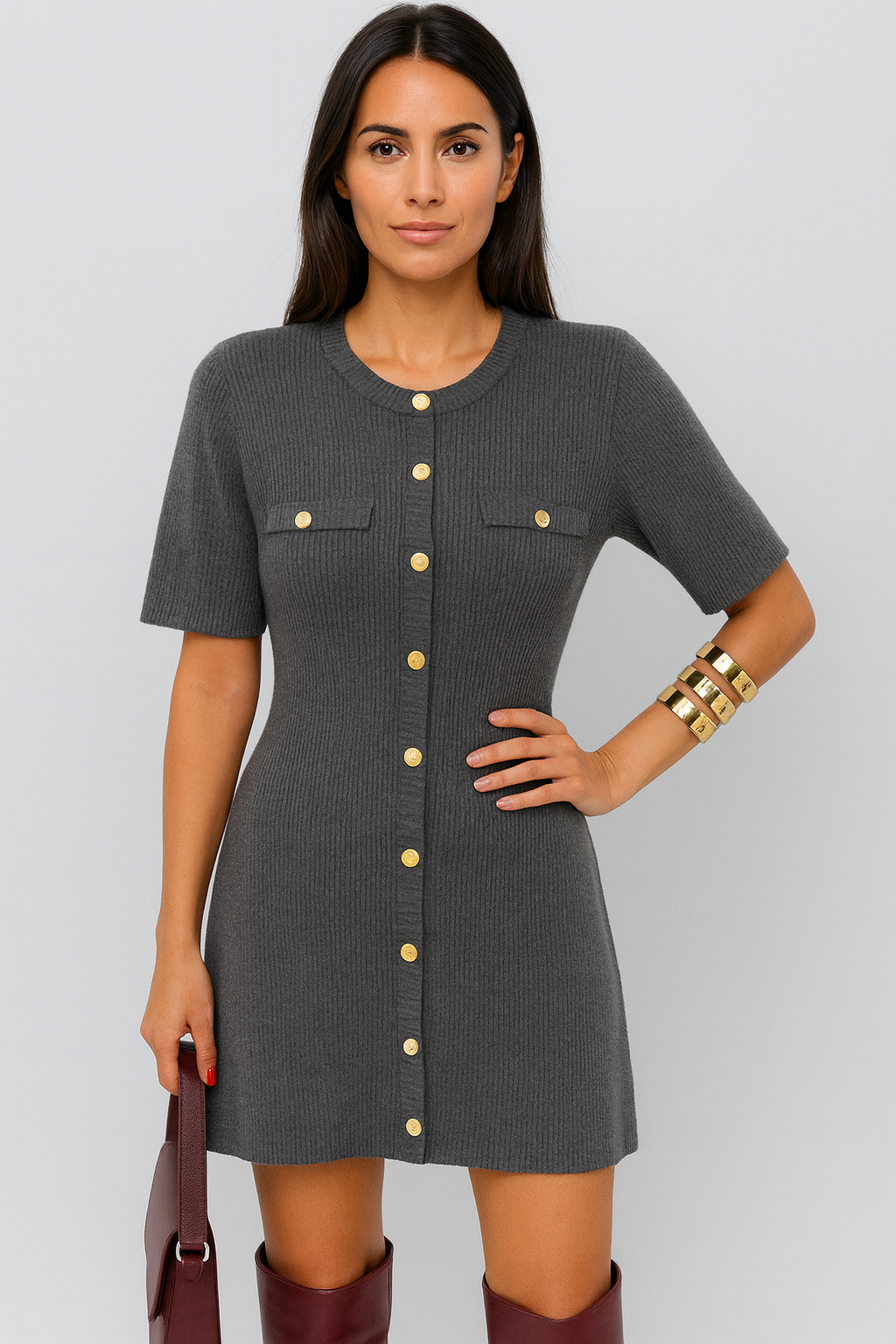 Deze jurk heeft een kort en recht model en is uitgevoerd met korte mouwen. Het ontwerp beschikt over een doorlopende knoopsluiting aan de voorkant en twee borstzakken met klep, wat zorgt voor een nette en gestructureerde uitstraling. De ronde halslijn draagt bij aan de eenvoudige en verzorgde look.