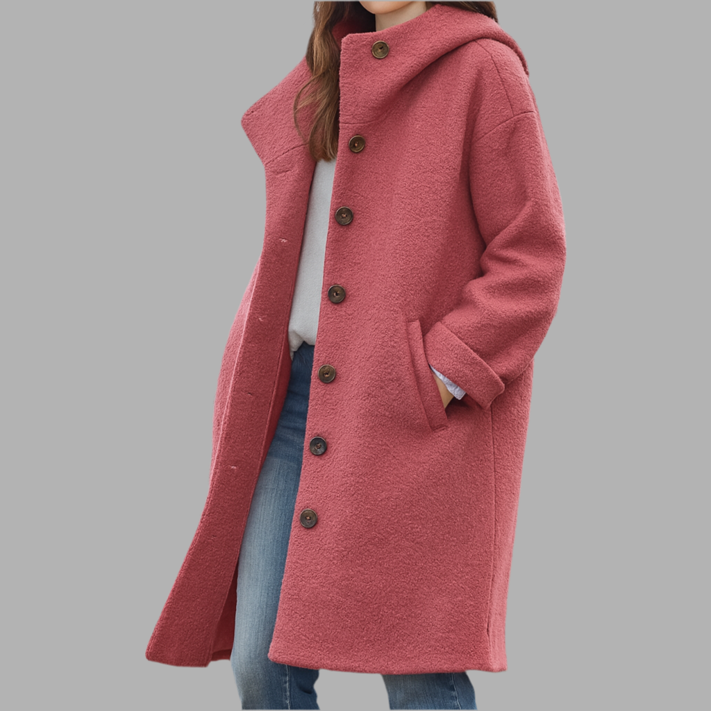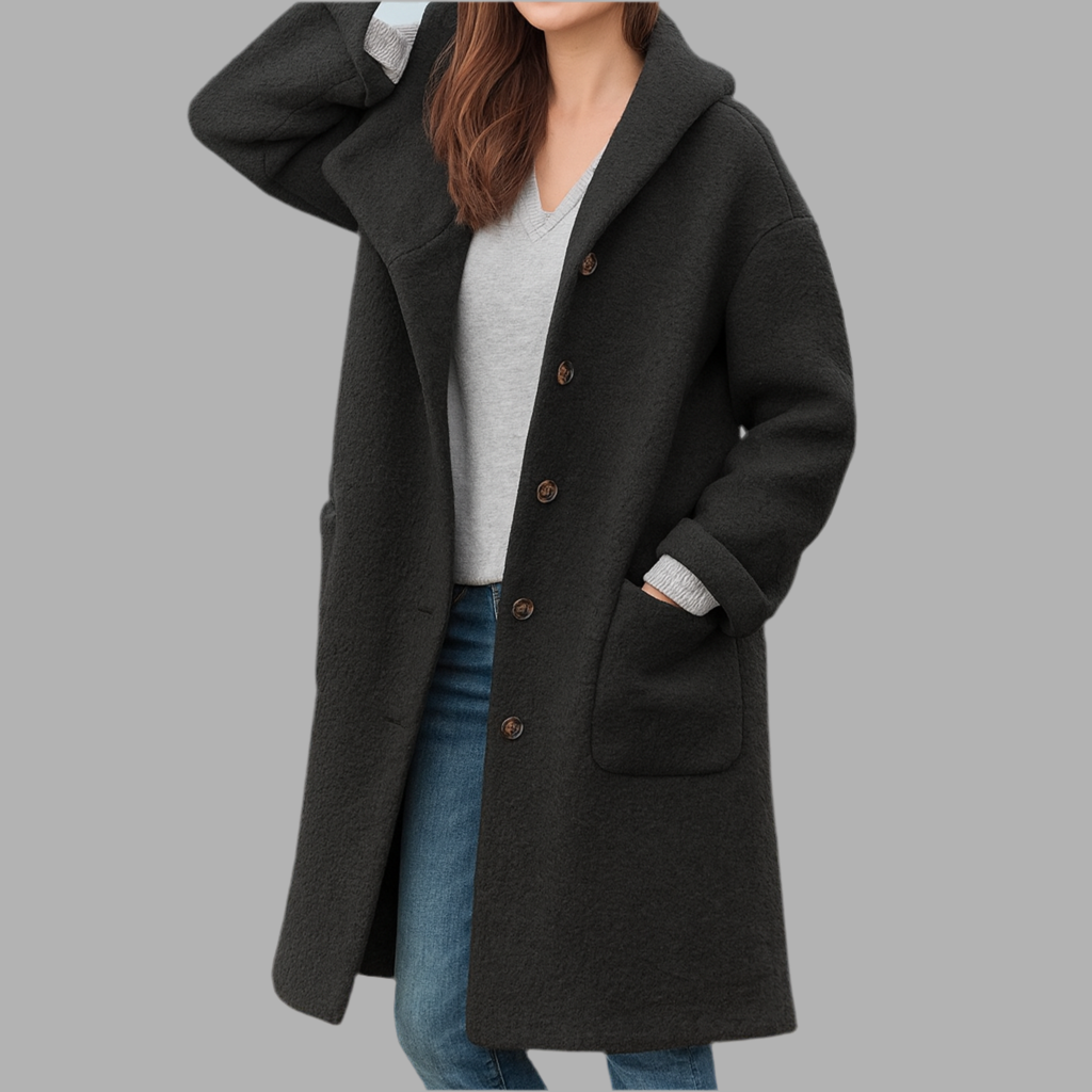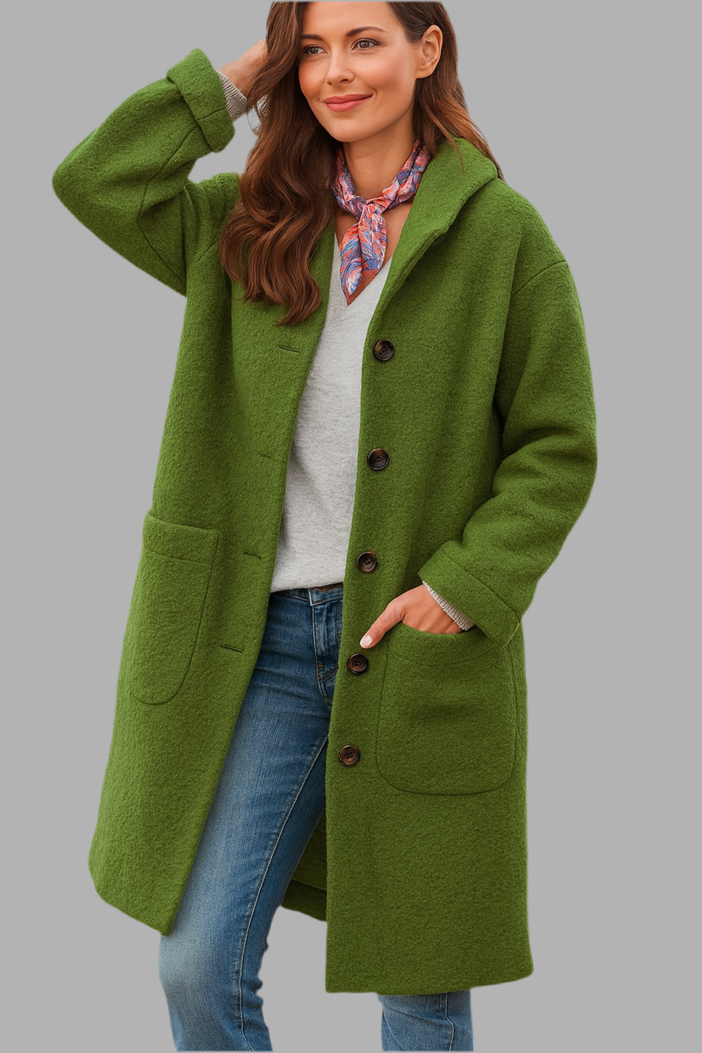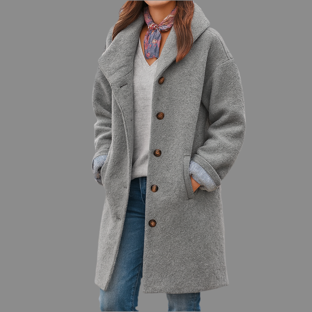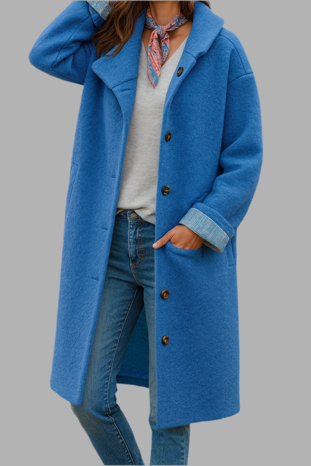 Lange damesjas met knoopsluiting en opgestikte zakken