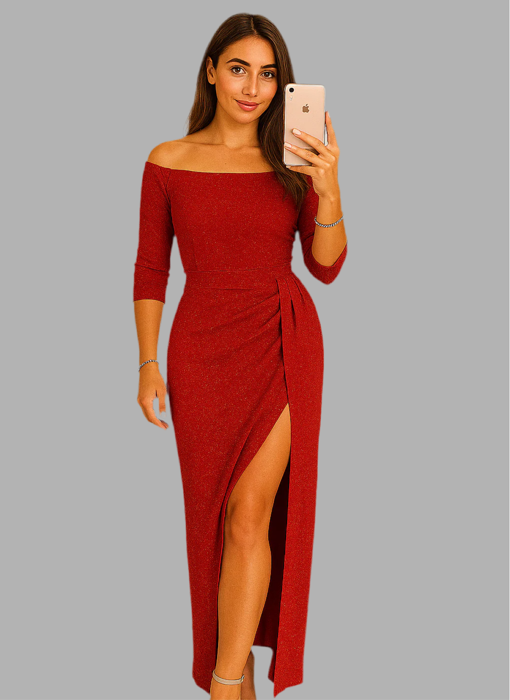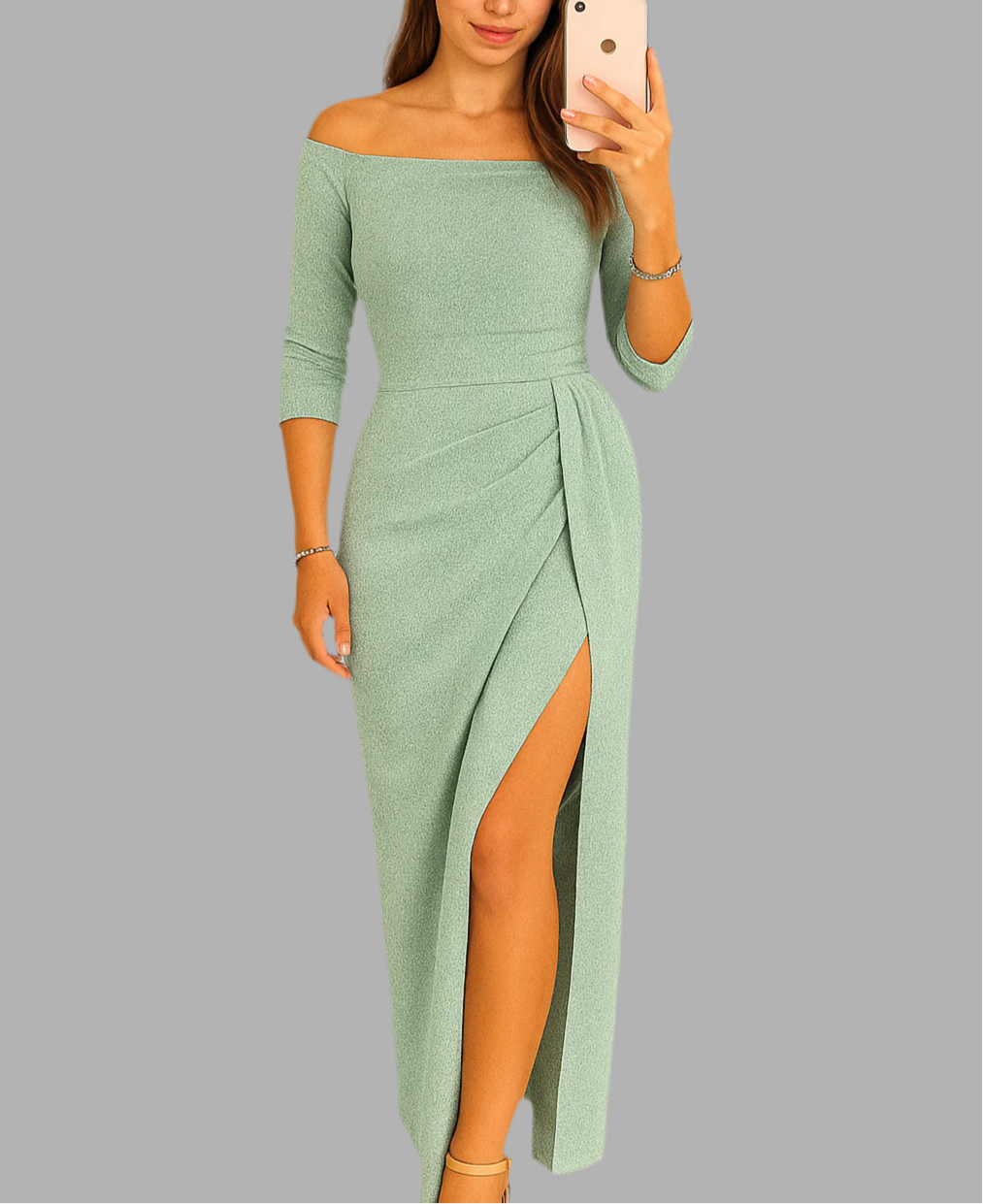 Deze jurk heeft een getailleerd model en een lengte tot de enkels. Het ontwerp is uitgevoerd met een off-shoulder halslijn en driekwartmouwen die zorgen voor een elegante uitstraling. De diepe split aan de voorkant geeft de jurk een opvallend detail, terwijl de plooien rond de taille bijdragen aan een verfijnde afwerking.