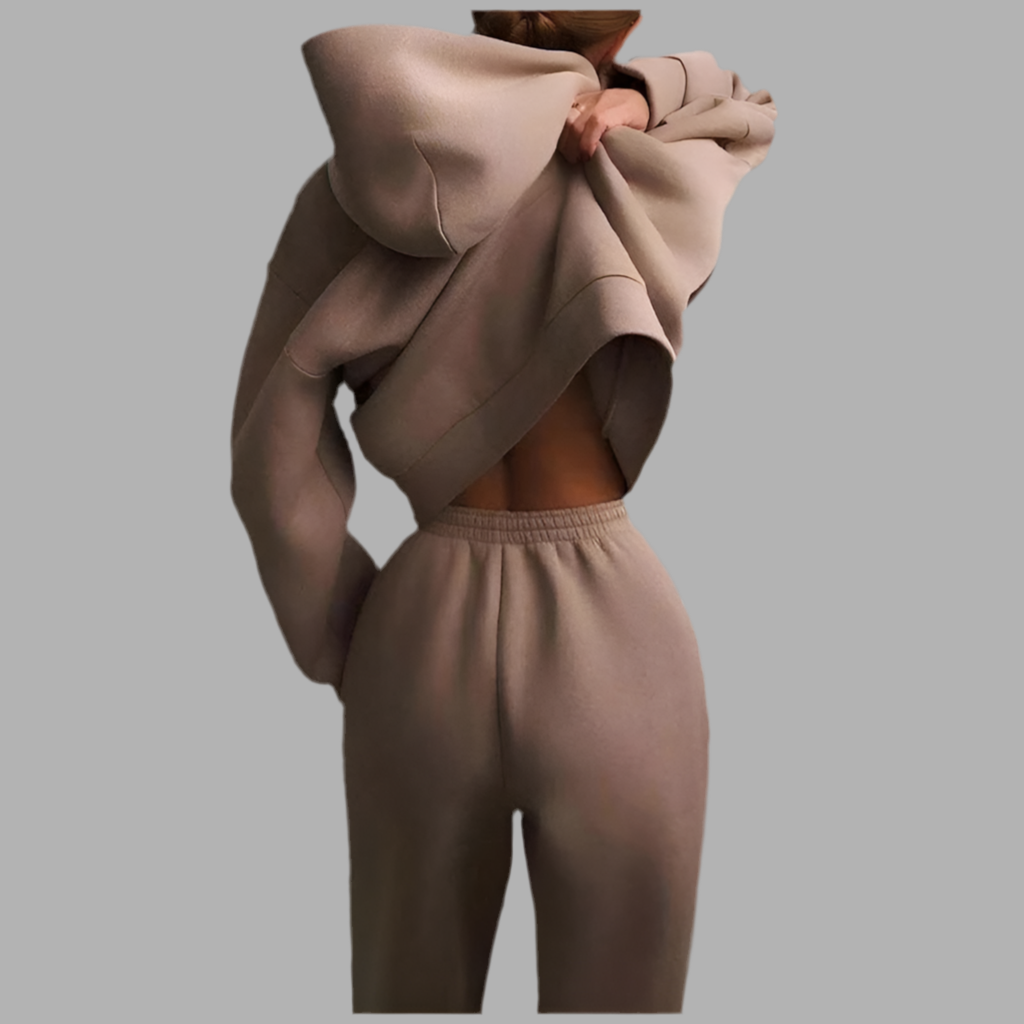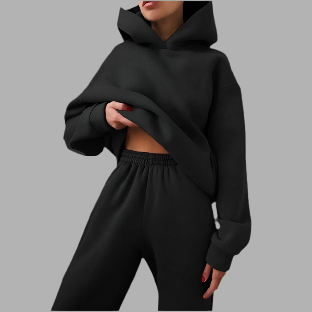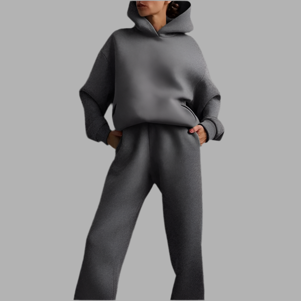 Deze set bestaat uit een trui met capuchon en een bijpassende broek. De trui heeft een ruime pasvorm met lange mouwen en een comfortabele capuchon. De broek is voorzien van een elastische tailleband, wat zorgt voor een goede aansluiting en draaggemak. Het eenvoudige ontwerp geeft de set een tijdloze uitstraling en maakt deze veelzijdig te combineren.